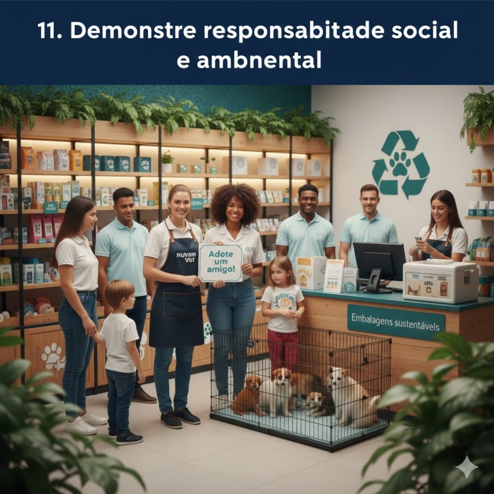Adoção de animais de abrigos locais, usar embalagens sustentáveis, apoiar causas relacionadas aos animais, enfim, são só alguns exemplos de demonstrações de responsabilidade social e ambiental, sempre tão positivas para os clientes.