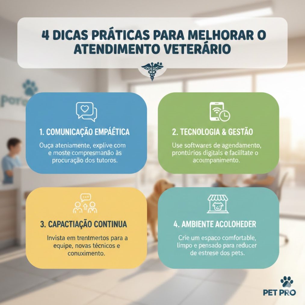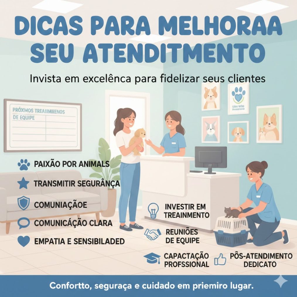 A dica, portanto, é não economizar na hora de garantir um bom atendimento, sendo fundamental que a equipe goste de animais, transmita segurança, seja simpática, empática, enfim, sensível, para poder lidar com todo tipo de cliente, para isso, procure investir em treinamentos e realizar reuniões de equipe frequentemente.
