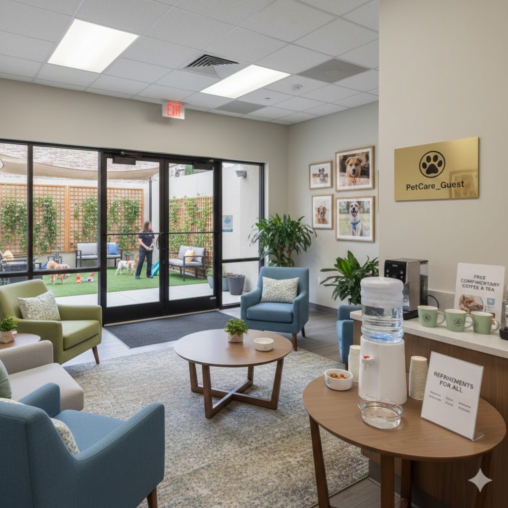 Não tem como criar uma boa experiência para o cliente se não garantir um ambiente confortável, começando pela recepção. É fundamental oferecer assentos confortáveis, climatização adequada e até água, para os tutores e pets, internet e cafezinho, por exemplo.