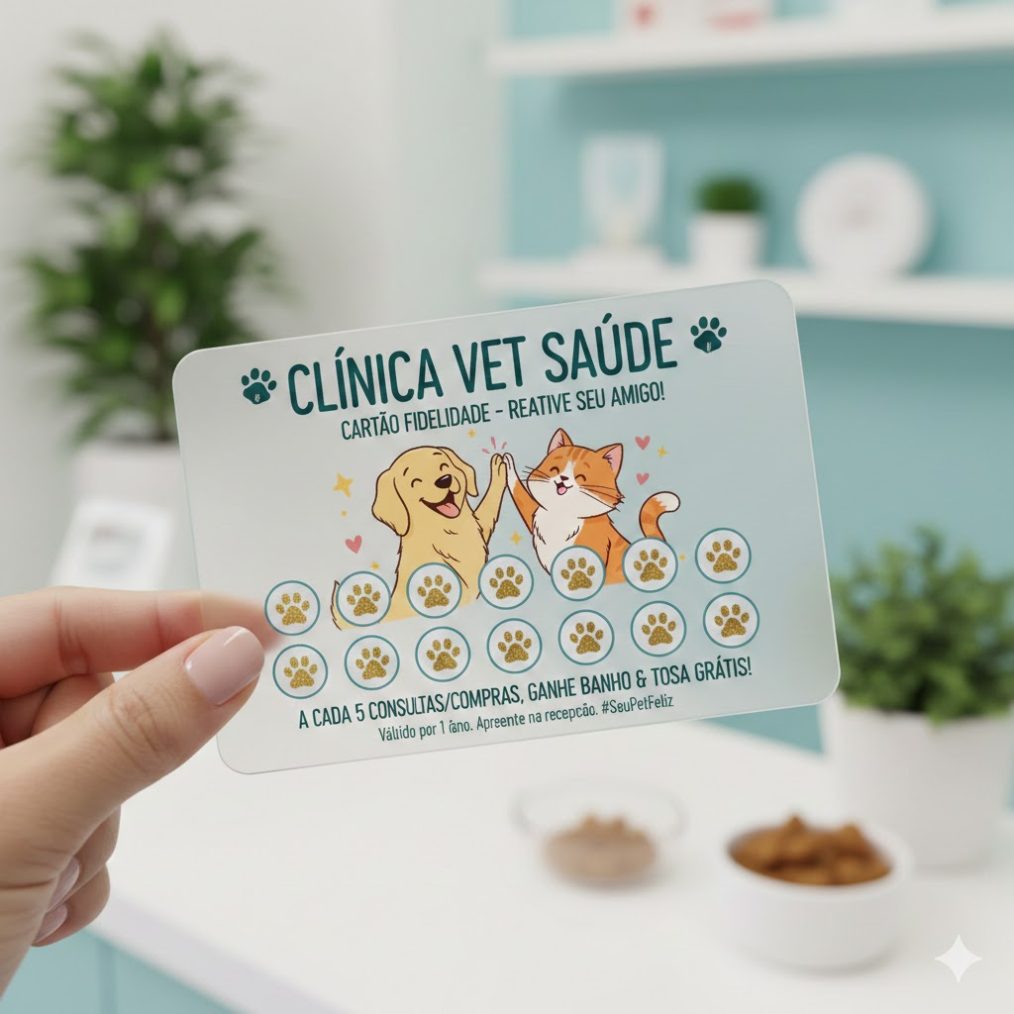 Mas, procure criar um cartão fidelidade personalizado, podendo ser oferecido após a primeira consulta na clinica, ou primeira compra no pet shop, e pode até enviar por e-mail, àqueles clientes que não retornam faz tempo.