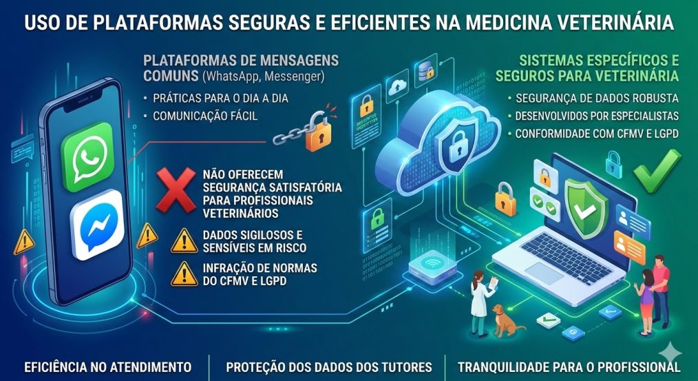 Porém, apesar dessas plataformas serem práticas na rotina do dia a dia e facilitarem a comunicação, elas não oferecem uma segurança satisfatória para profissionais veterinários, que lidam com informações sigilosas e sensíveis dos tutores.