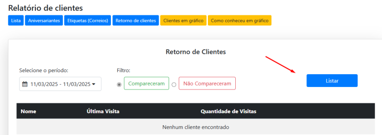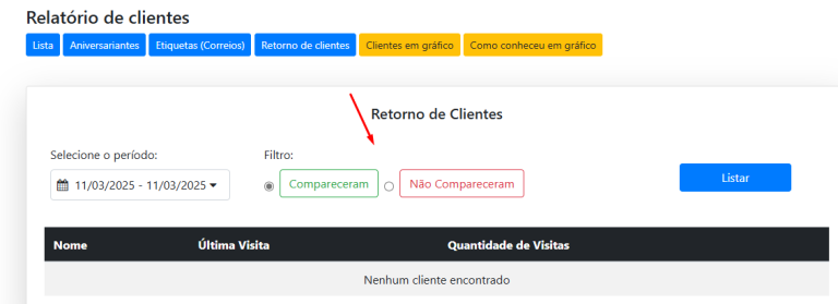 Além disso, também é possível listar os clientes que compareceram nesses períodos, permitindo um acompanhamento completo.