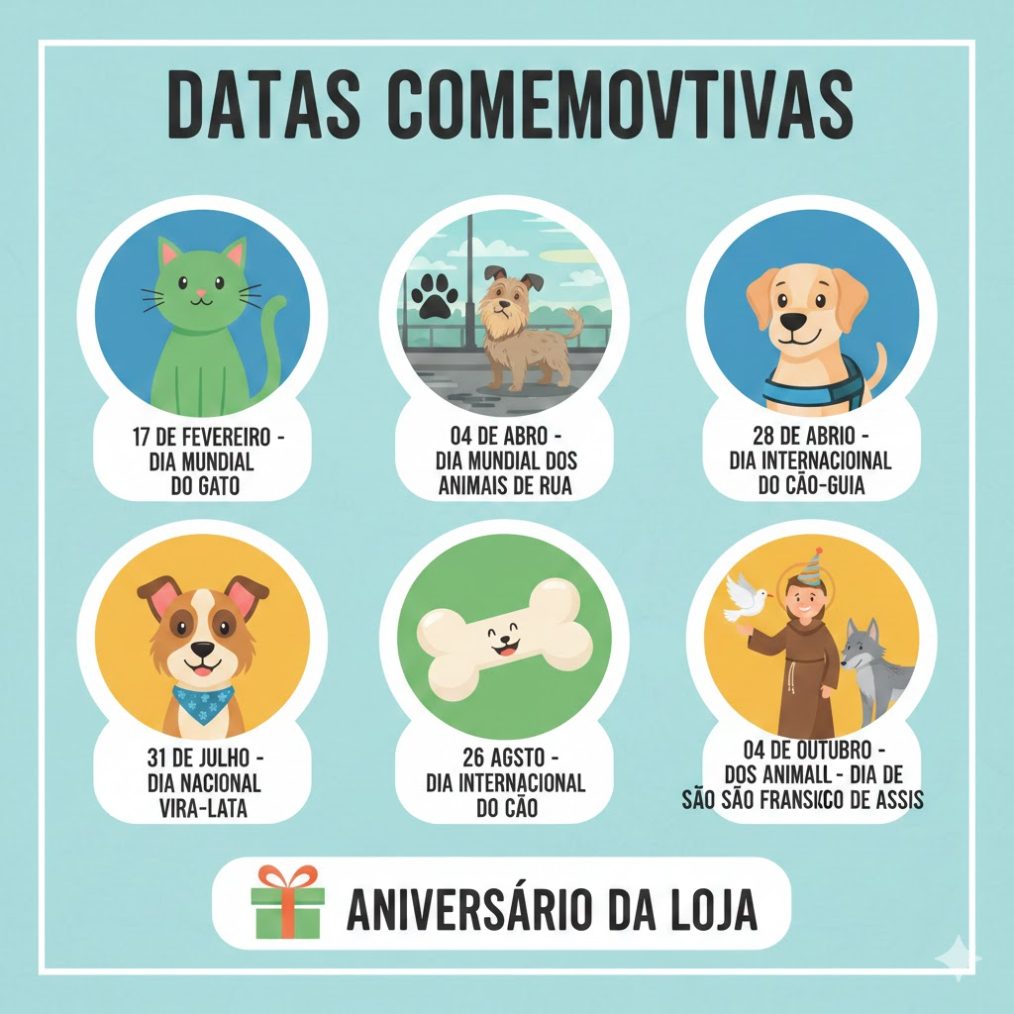 Sem dúvida, uma ótima ocasião para oferecer promoções especiais em produtos, como brinquedos, acessórios e alimentos. Também pode oferecer descontos em serviços, como banho e tosa.