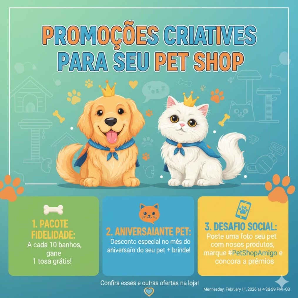 E é isso, no mais, lembre-se de adaptar as promoções de acordo com as preferências e necessidades dos seus clientes. Fique atento às tendências do mercado de pets e busque sempre inovar e surpreender seus clientes com promoções criativas e relevantes para eles.