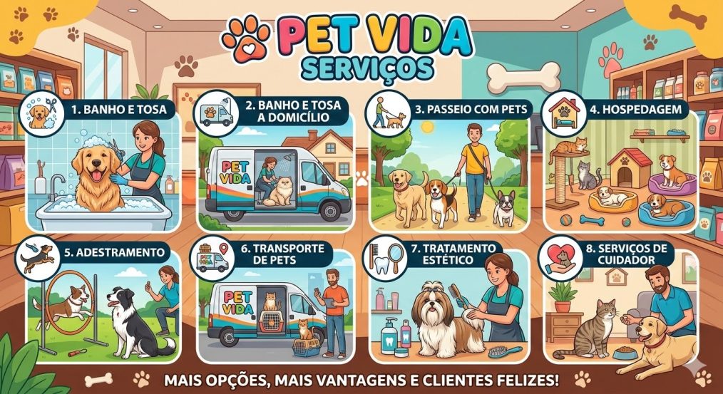 . serviços de cuidador — profissional conhecido como pet sitter (babá), geralmente, contratado para cuidar de cães idosos, levando-os para passear e ao veterinário, cuidando de sua alimentação, entre outros cuidados diários. Você poderá contratar alguém no seu pet shop para fazer isso ou firmar uma parceria com um profissional que realize essas atividades.
