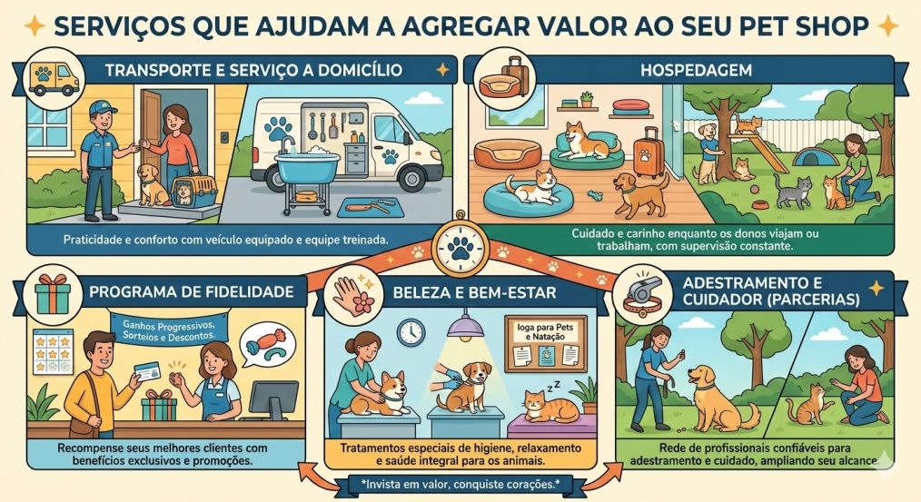 A primeira sugestão, portanto, é procurar ampliar os serviços oferecidos no seu pet shop, por exemplo, oferecendo uma ou mais das seguintes opções:
