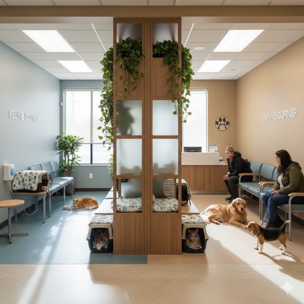 Tenha uma área de espera separada para gatos e cães. Gatos podem se sentir extremamente estressados na presença de cães, então um ambiente tranquilo apenas para felinos é essencial.
