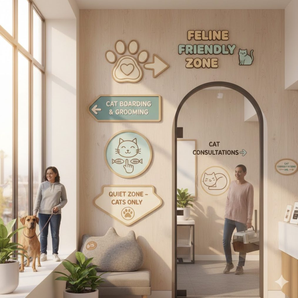 Utilize sinalização cat-friendly para orientar os proprietários de gatos e informá-los sobre as áreas específicas para gatos na clínica.