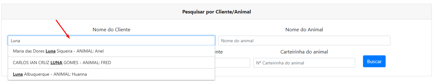 No painel inicial, utilize a barra de pesquisa para encontrar o animal desejado.