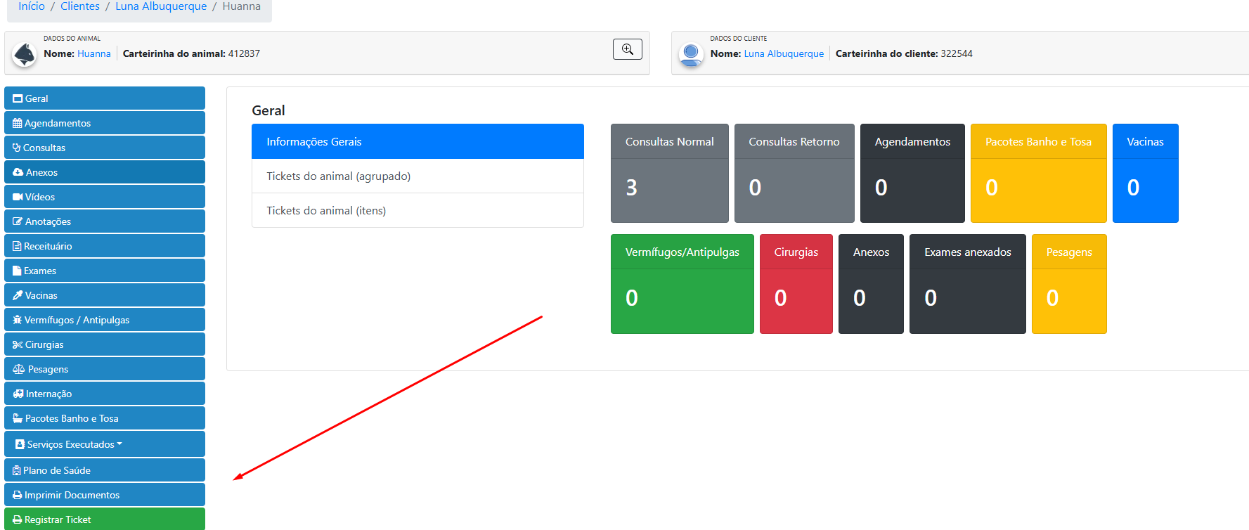 Dentro da ficha do animal, localize a opção Imprimir Documentos.